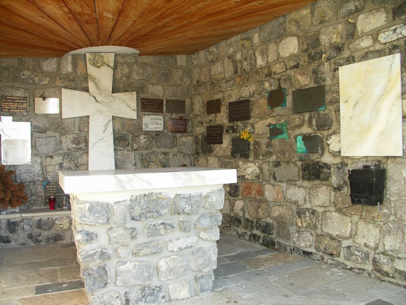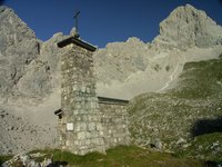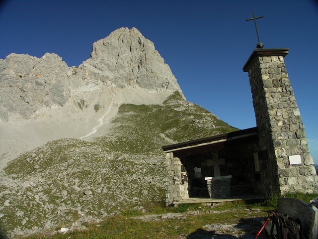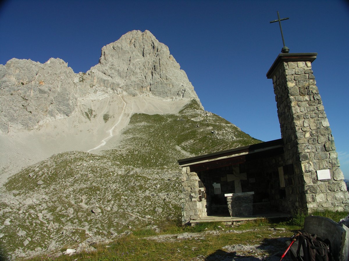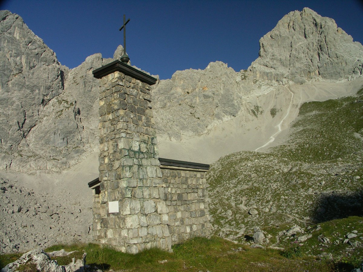 Linkes Bild: Die Lamsenjochhütte auf 1953 m. Mittleres Bild: Die Kapelle hinter der Hütte. Rechtes Bild: Kapelle innen Gut sichtbar ist die Geröllabfahrt, rechts der weiße Streifen herunter und der Einstieg zum Brudertunnelsteig, der etwa rechts neben dem mittleren Kar liegt 8.00 Uhr Weiter
