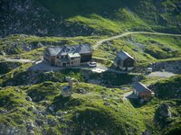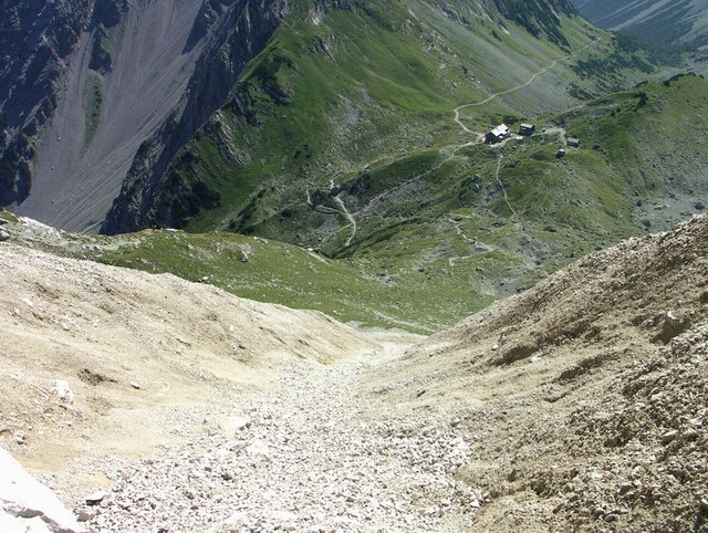Mittleres Bild: Blick ins Falzthurntal. Rechtes Bild: Blick in Richtung Hochnissl Hier sieht man den Weg den man raufging wie auch den Binsalm Hochleger sehr gut. Auf der anderen Seite ist der Weg gegrenzt durch das Hahnkampl (2080m), dahinter hoch aufragend das Sonnjoch mit 2457 m 10.18 Uhr Aufbruch vom Gipfel 10.52 Uhr An der Lamsenscharte. Hier kommt nocheinmal ein kurzer gut gesichter Steig. Bild links: Kurz vor der Lamsenscharte. Bild Mitte: Von der Scharte aufs Geröllfeld und den Steig fotografiert. Bild rechts: Der Steig von der Scharte zum Geröllfeld 11.04 Uhr Am Geröllfeld. Jetzt wird abgefahren! Nach dem Geröllfeld Ich trinke eine Radler für 3,50 Euro. 11.35 Uhr Aufbruch von der Lamsenjochhütte (1953m). Sie wurde 1908 erbaut.