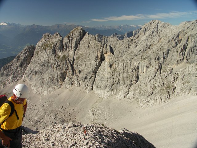 Linkes Bild: Am Grat, von dem aus man den Weg über die Lamsenscharte sieht. Mittleres Bild: Blick zurück nach ein paar hundert Meter Hangquerung, im Hintergrund der Hochnissl. Rechtes Bild: Die Hangquerung, ein paar hundert Meter sind noch zu lauf dann gehts in den nächsten Steig 9.17 Uhr Am Klettersteig