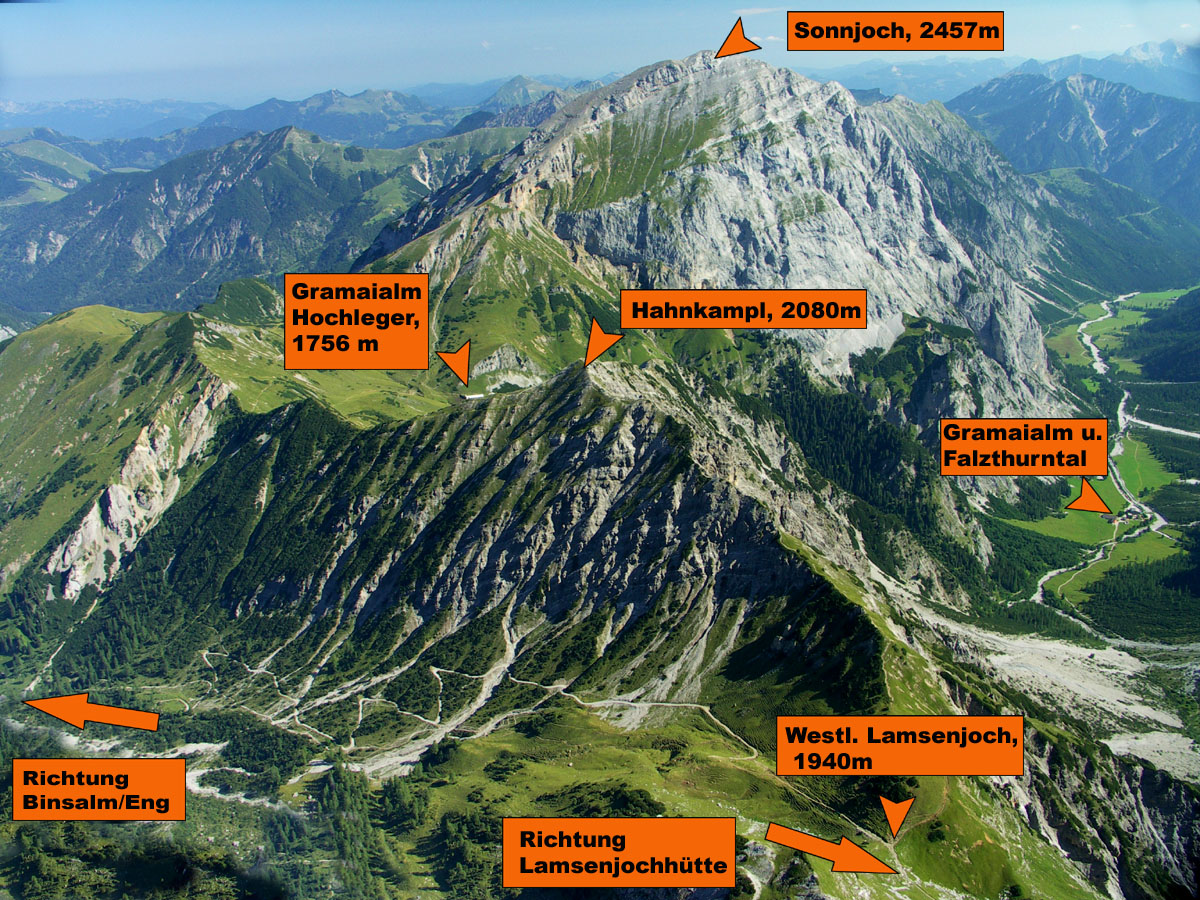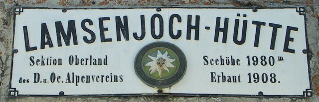(Engparkplatz (1000m), Binsalm (1502 m), Westl. Lamsenjoch (1940 m), Lamsenjochhütte (1953m), Lamsenspitze (2508m ) |